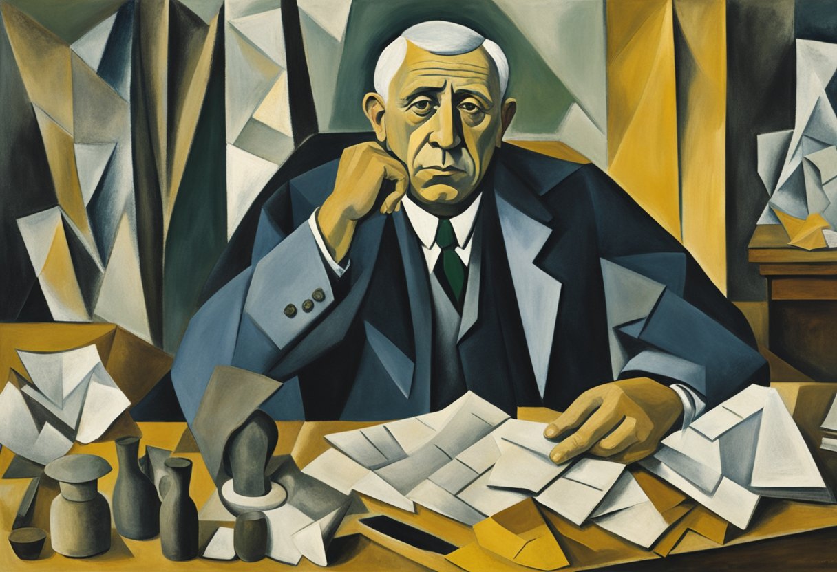 A determined figure sits at a desk surrounded by legal and financial documents, with a look of resolve and determination on their face