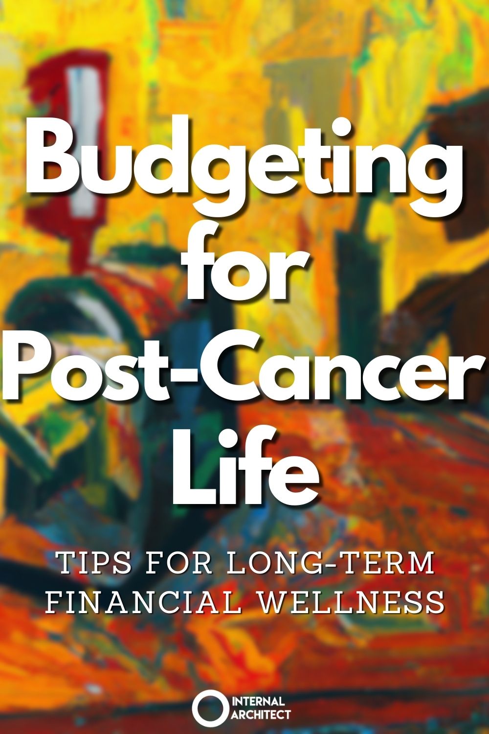 A painting named "Budgeting" in the style of conceptual art with the text Budgeting for Post-Cancer Life: Tips for Long-Term Financial Wellness