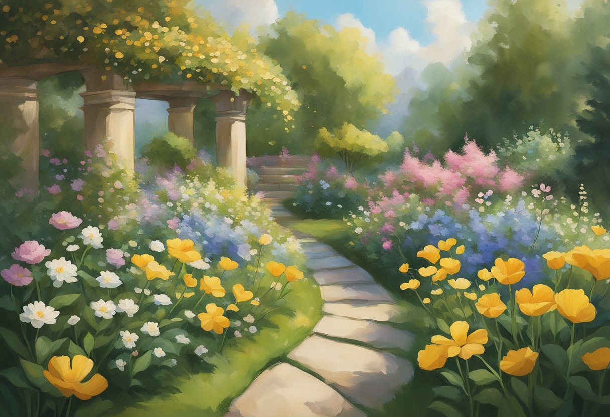 A serene garden with blooming flowers and a gentle breeze, symbolizing the healing power of gratitude