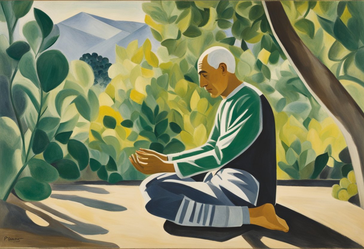 A man practicing yoga in a serene outdoor setting, surrounded by greenery and sunlight, with a sense of calm and determination in his posture