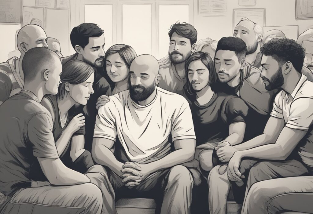 A male cancer warrior engages in conversation with a support group, sharing experiences and seeking advice on rebuilding relationships